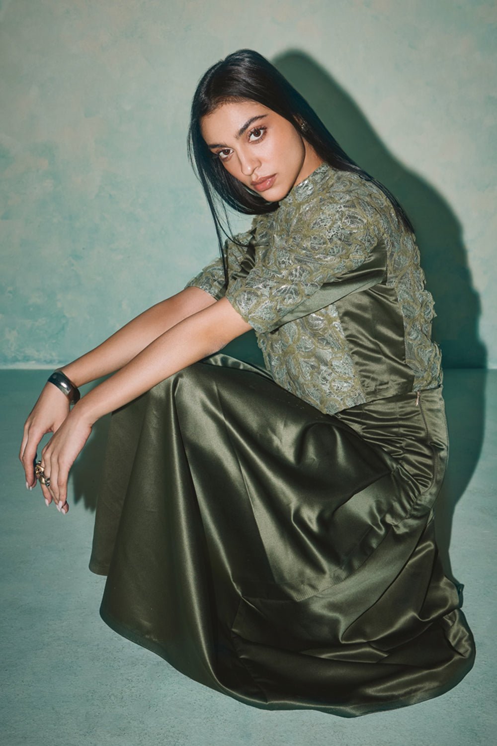 Refined and structured, this coordinated set pairs an intricately textured top with a beautifully tailored box-pleated skirt. The top’s rich texture adds depth, while the skirt’s sculpted pleats create a clean, voluminous silhouette that moves with effortless grace. Balanced and sophisticated, the ensemble is perfect for daytime celebrations, intimate gatherings, or festive occasions that call for modern elegance with timeless charm.