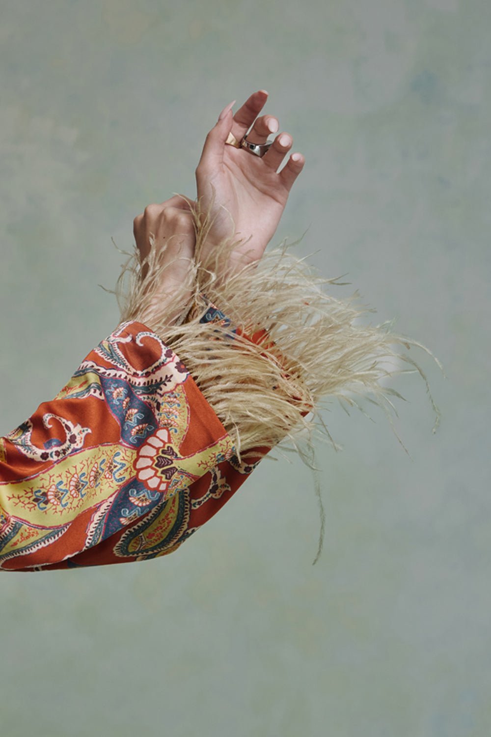 Elegant and expressive, this paisley-printed gown flows effortlessly with its elongated silhouette and warm, vibrant palette. The fitted bodice features subtle cut-outs that add modern edge, while the long sleeves are finished with delicate feather accents for soft movement. Fully lined and secured with a concealed back zipper for a seamless fit, it’s perfect for festive evenings, artistic gatherings, or statement occasions.